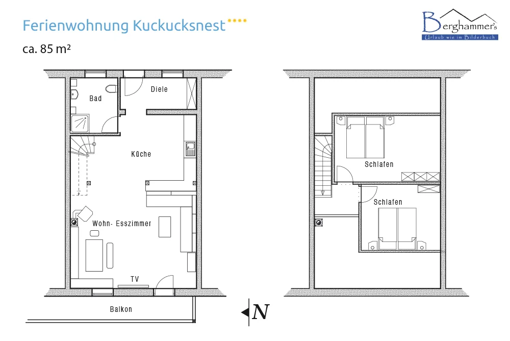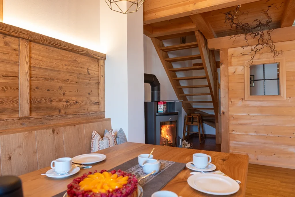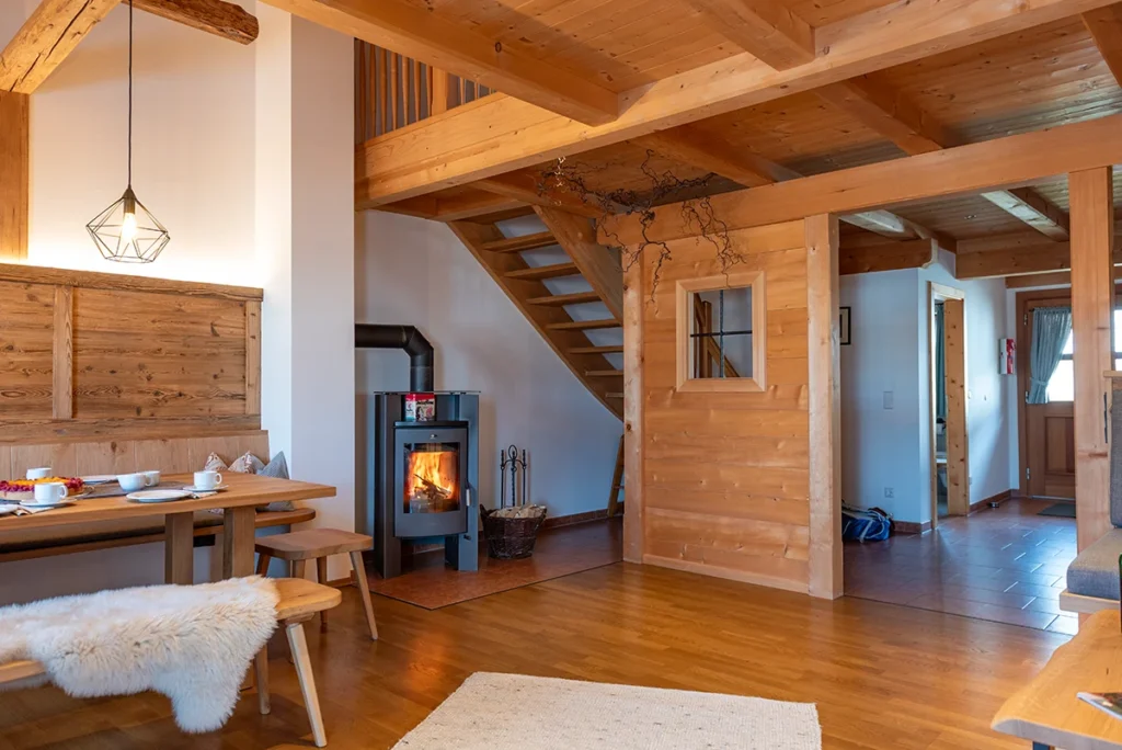 Die Wohnung hat ca. 85 m², zwei Schlafzimmer, ein Badezimmer mit Toilette und Dusche, eine Küche die vom Wohnraum durch einen Raumteiler abgeteilt ist, einen großen Wohnraum mit Essplatz, Couch und Kaminofen, einen Balkon und eine Sitzgelegenheit vor der Wohnung.