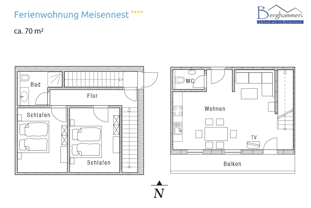 Die Wohnung hat ca. 70 m², zwei Schlafzimmer mit jeweils einem Doppelbett, eine seperate Toilette, ein Badezimmer mit Toilette und Dusche, eine geräumige Wohnküche mit Essplatz, Couch und einen Balkon.